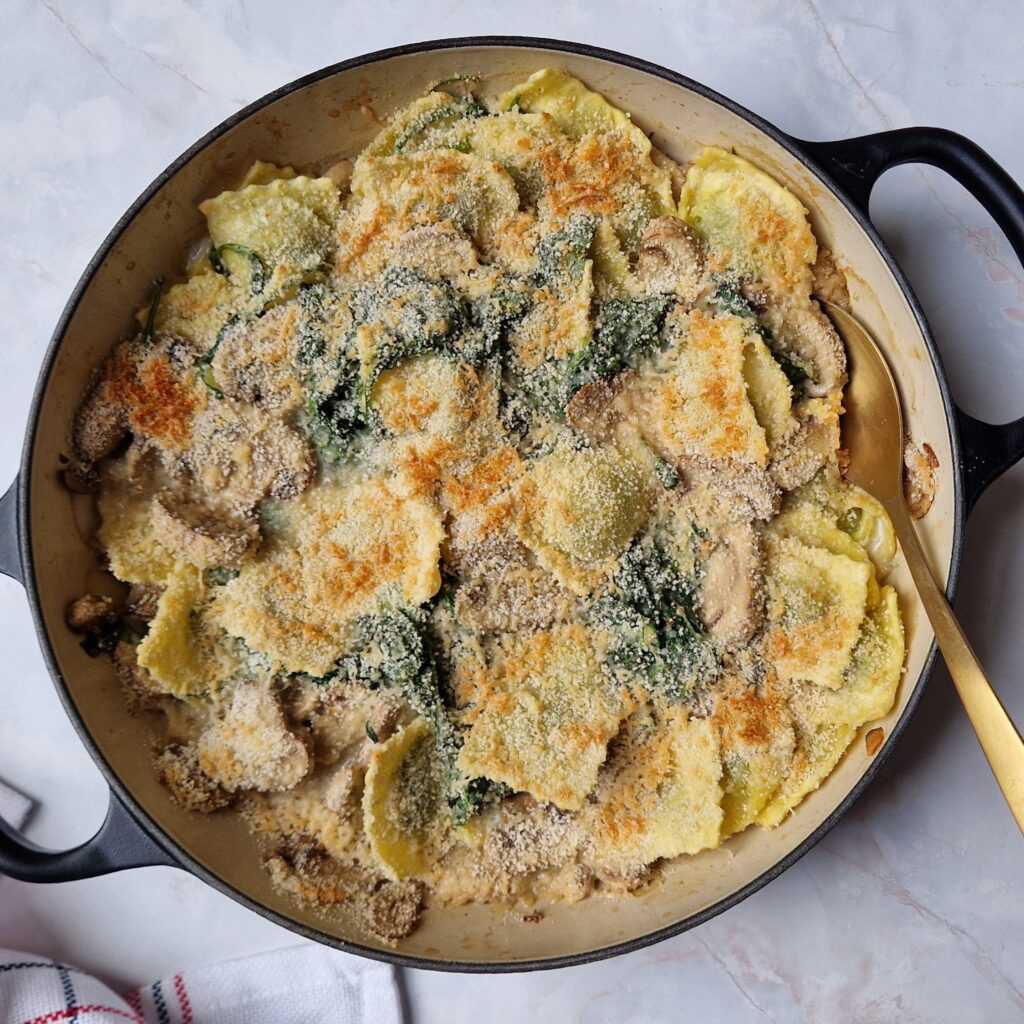And the other option, that I’m sharing more in-depth on this page is Baked Ravioli. It’s ravioli that is quickly cooked for 4 minutes in water, and then added to a pan or oven dish. You only need to bake the ravioli in the oven for 3-5 minutes. So in total you’ll have this dish on the table within 20 minutes.